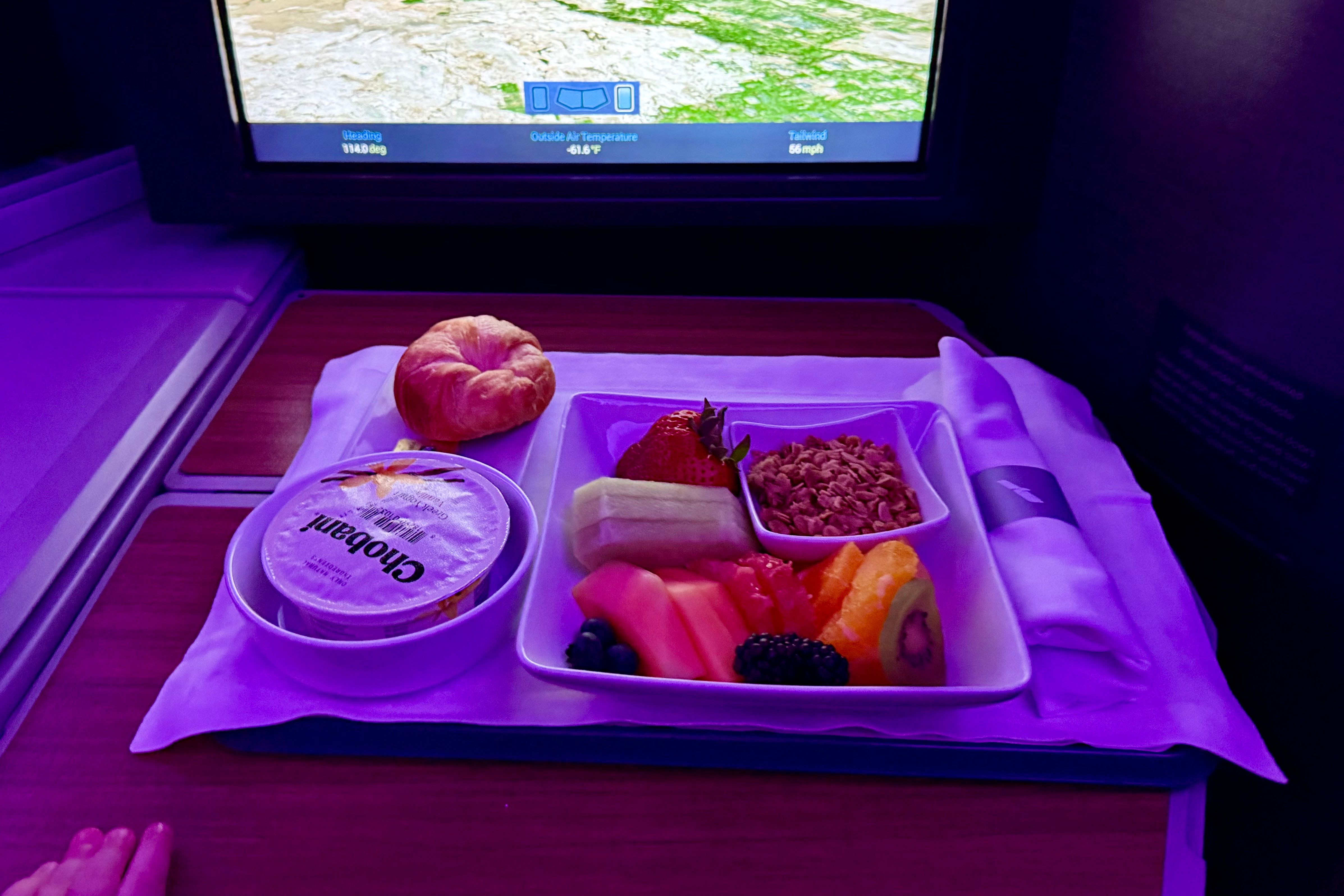 I’m happy to report that my daughter and I managed to get seven hours of sleep in our shared pod. We went to bed shortly after takeoff, and she woke me up just as breakfast was being served. (The yogurt and fruit plate hit the spot.)
