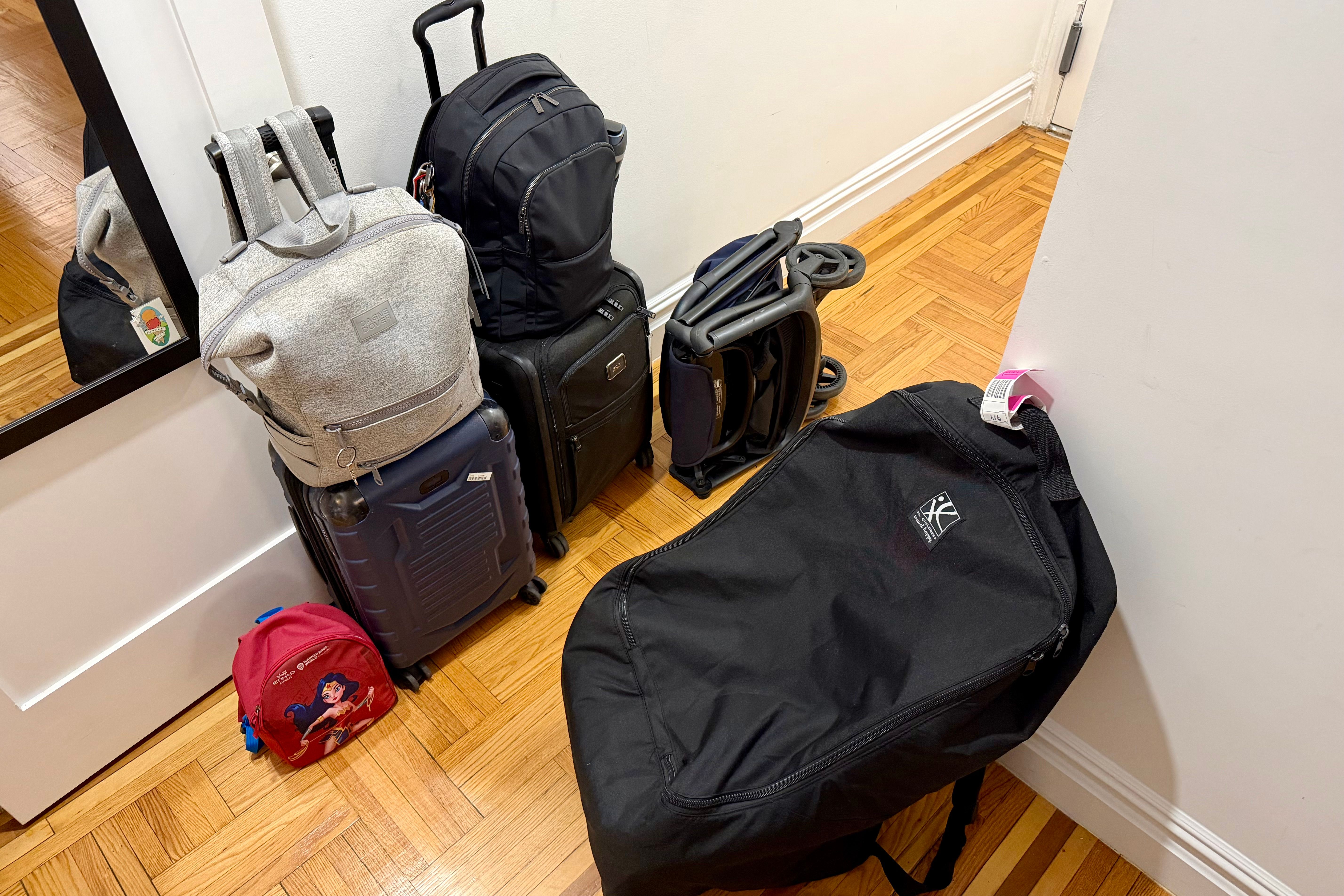 My one-year-old daughter and I were flying solo. My wife met us in Florida after work, so I was in charge of carrying two rollaboards, two backpacks, a stroller, a car seat, and our daughter.