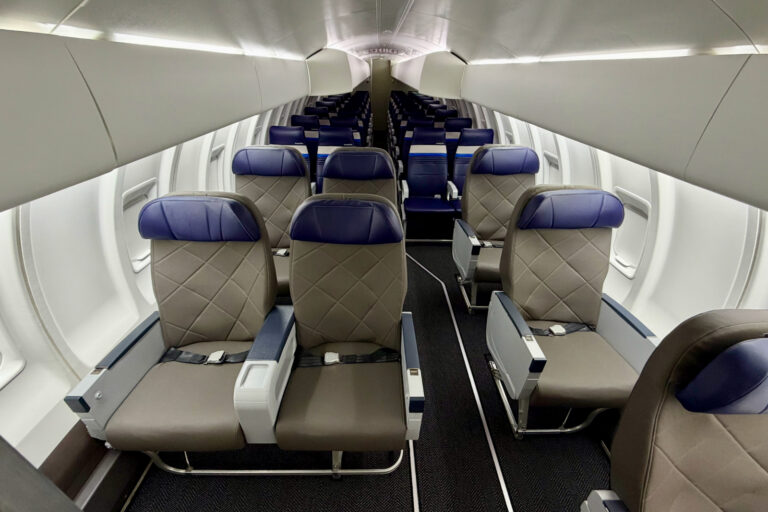 Seats are arranged in a 1-2-1 configuration. Window seats angle away from the aisle, while the center seats alternate depending on whether you’re in the forward or rear cabin.